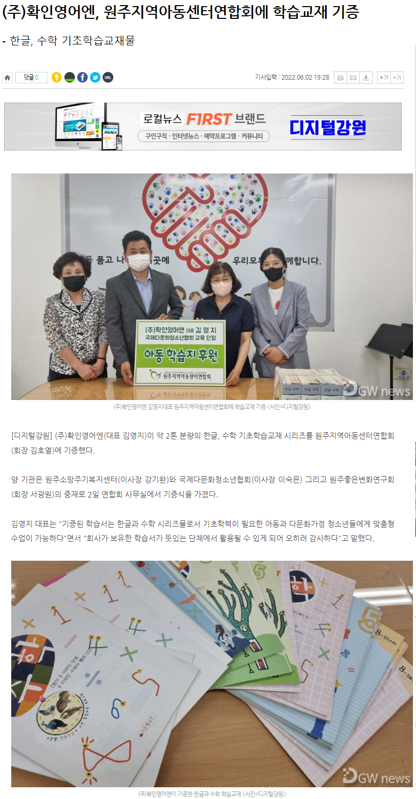 안녕하세요. (주) 확인영어엔 입니다. 저희는 6월 2일 강원도 원주 지역아동센터연합회에 어린이들이 사용할 수 있는 학습교재를 기증하는 기증식을 가졌습니다. 아래를 클릭하시면 디지털 강원의 기사를 보실 수 있습니다. (주)확인영어엔, 원주지역아동센터연합회에 학습교재 기증 (digitalgw.co.kr)