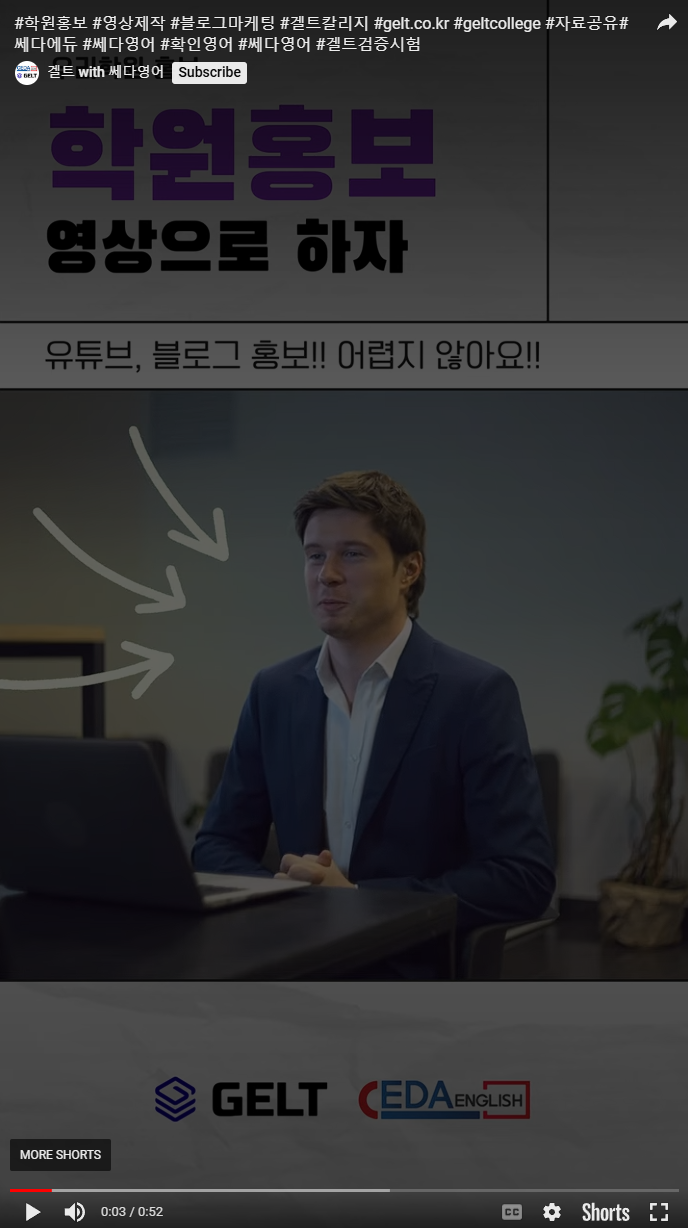 #학원홍보 #영상제작 #블로그마케팅 #겔트칼리지 #gelt.co.kr #geltcollege #자료공유#쎄다에듀 #쎄다영어 #확인영어 #쎄다영어 #겔트검증시험 (youtube.com)
